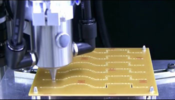 Der JR3000ERT zeigt, wie er präzise Schnitte auf einer Leiterplatte ausführt.