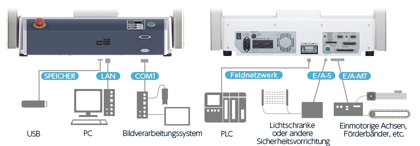 ・E/A-MT Erweiterung (optional) für bis zu 2 zusätzliche Achsenmotoren, die vom Roboter ohne zusätzliche SPS gesteuert werden können.